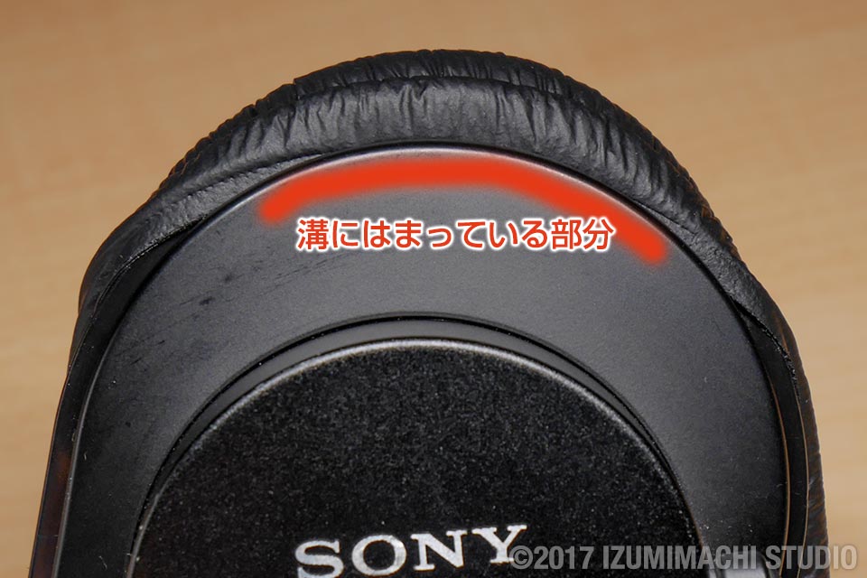 イヤーパッドとハウジングの形(楕円形)を合わせて、ハウジング上部の溝にイヤーパッドの端を引っ掛けるようにはめます。